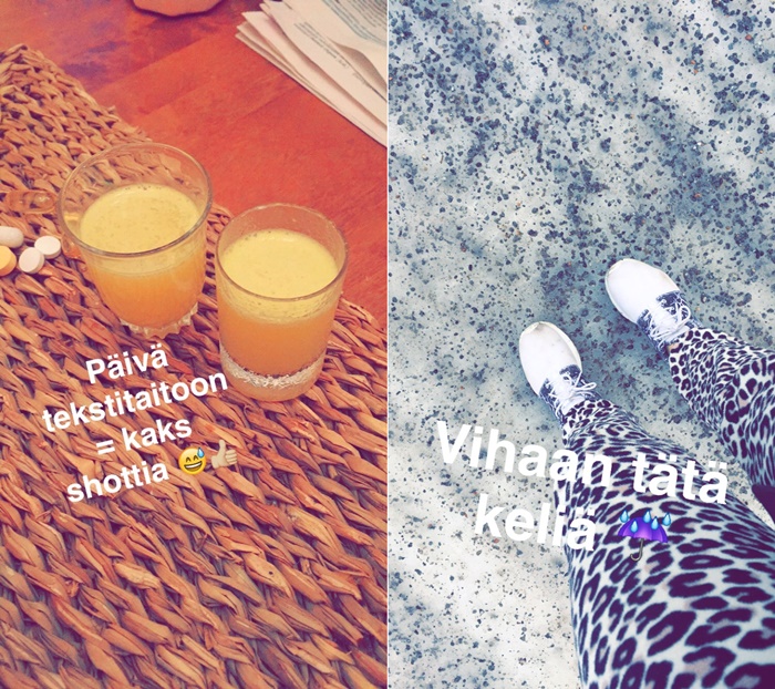 Hyvä kun olin ennen kaheksaa palannut kotiin ruokakaupasta. Taas vaihteeksi löytyi selkeästi lukemista parempaa tekemistä = puhelimessa juoruaminen ja snäppäily. Jotenkin "mitään ei oo enää tehtävissä"-asenne on vallannut mut jo pari päivää sitten ja oon antanu vaan mennä :-D Koko illan mietin syyllisenä, että pitäiskö ne kirjat oikeasti avata, mutta ei vaan tunnu siltä. Näillä mennään mitä on!
